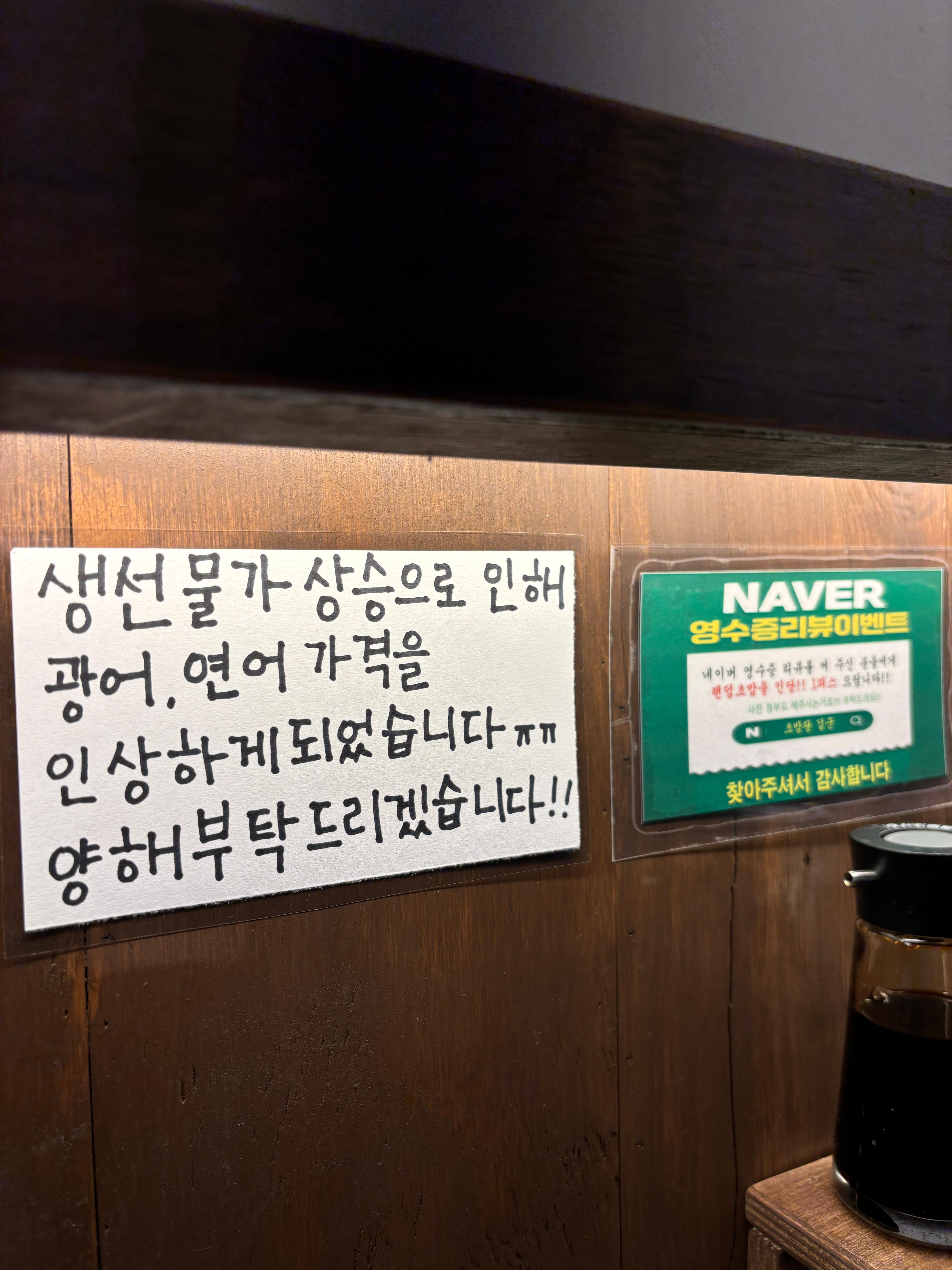 생선 물가 상승으로 광어, 연어 가격을 인상하셨다고 적혀있는데 가격은 적당한 편이었다.