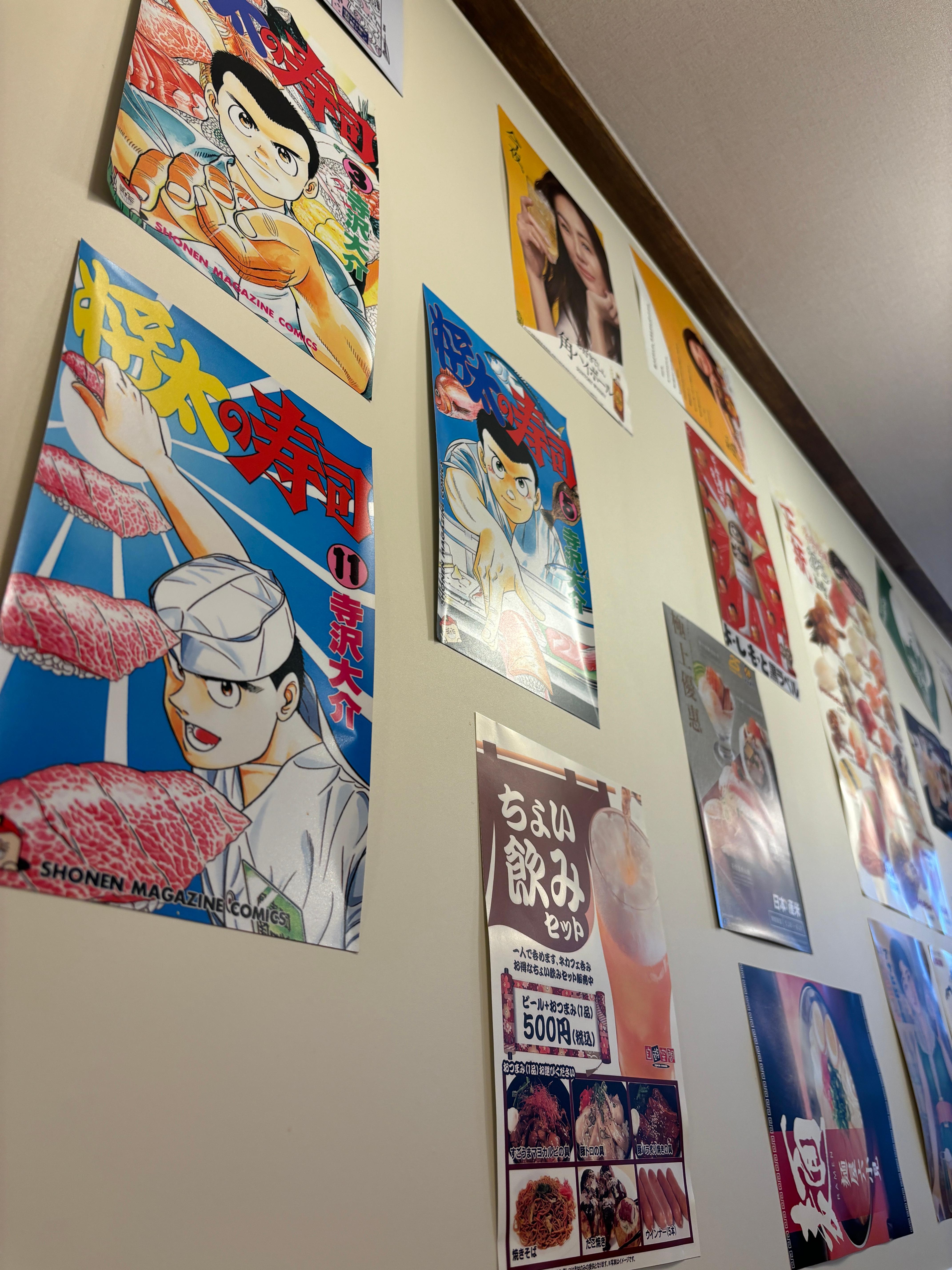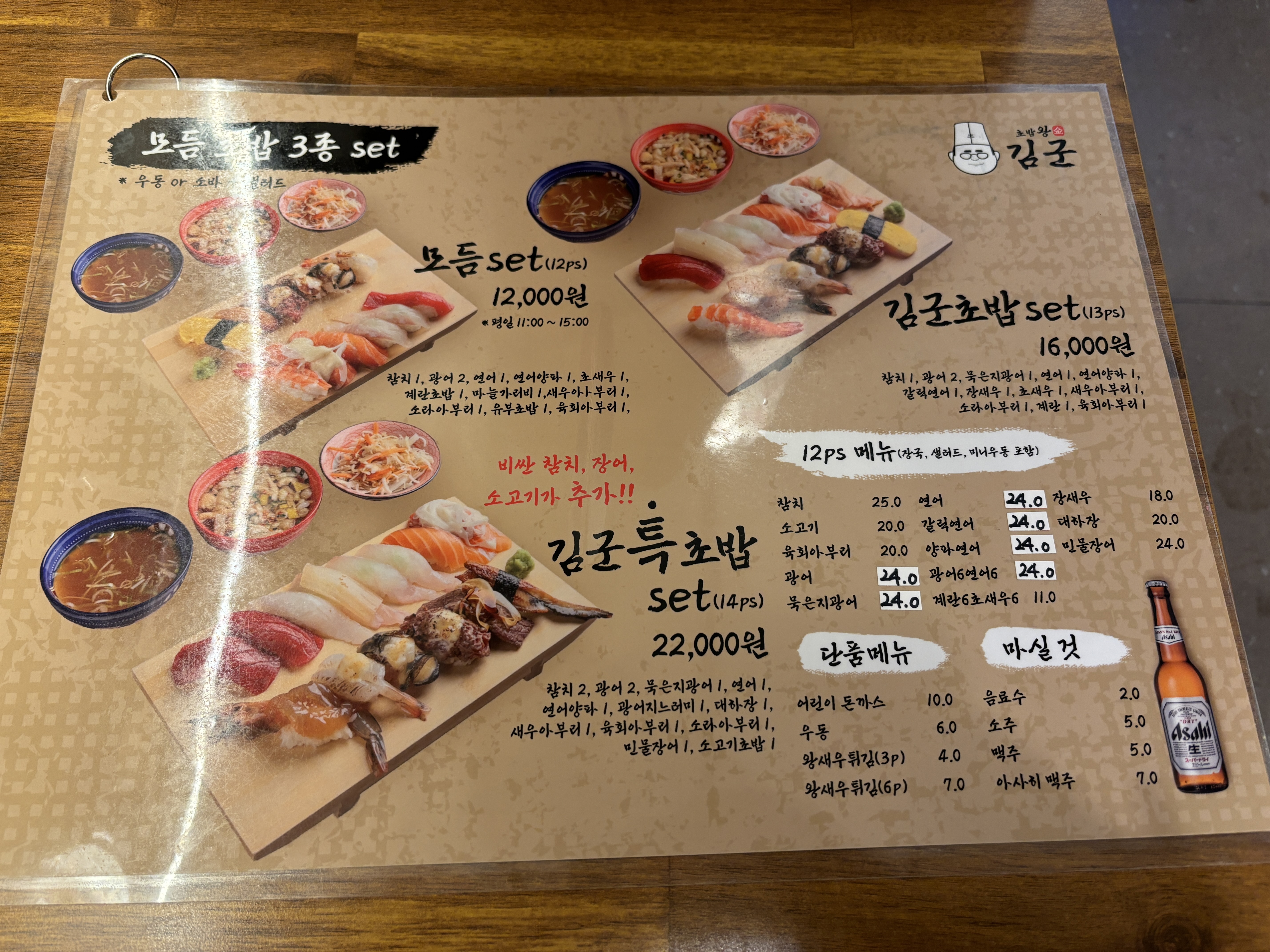 메뉴는 테이블 옆에 걸려있고 우리는 김군초밥 세트로 시켰다.