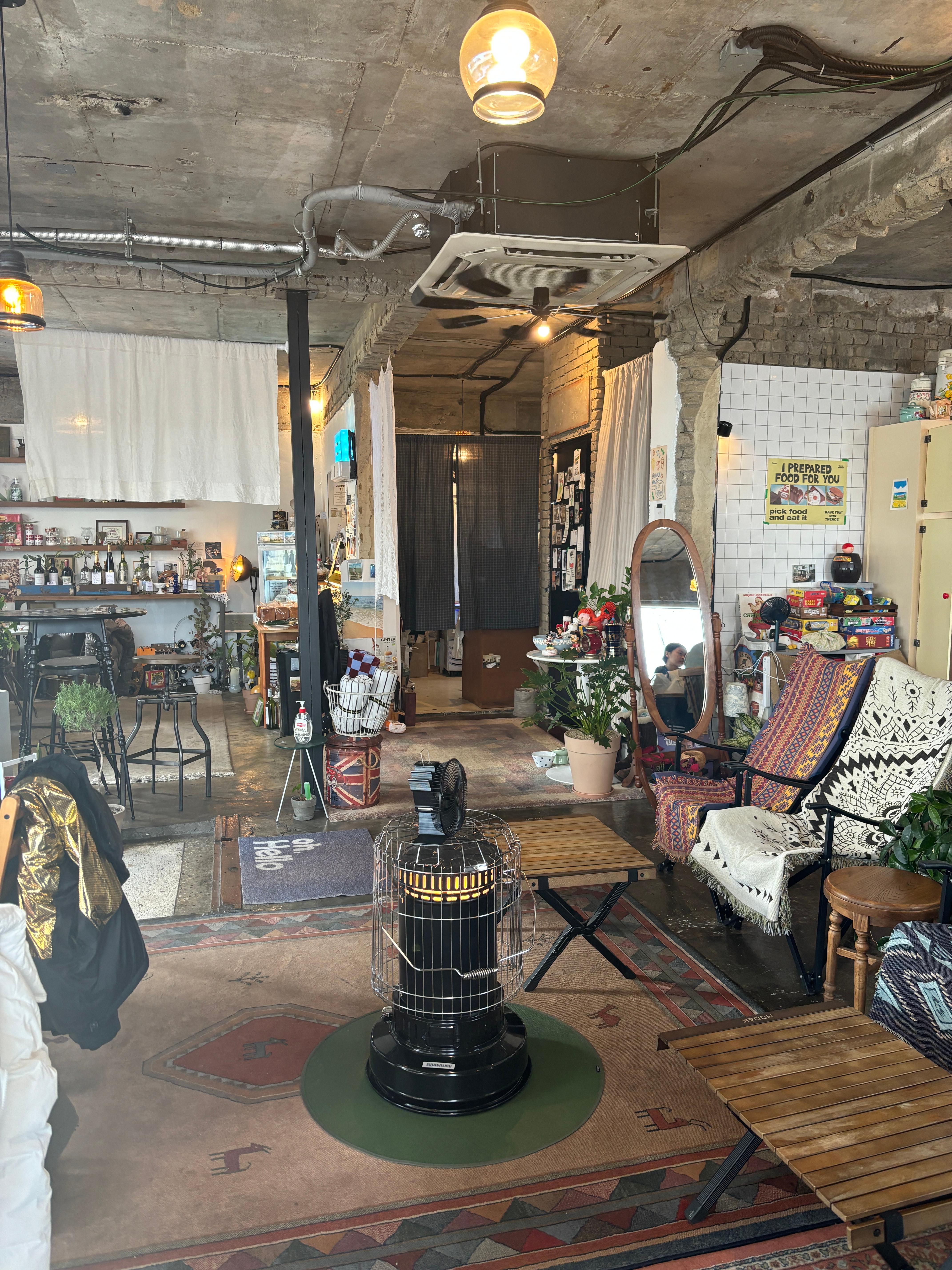 외관은 주택을 개조해서 카페로 만든 느낌이다. 내부는 애스닉한 느낌인데 캠핑 테이블과 의자가 있어서
